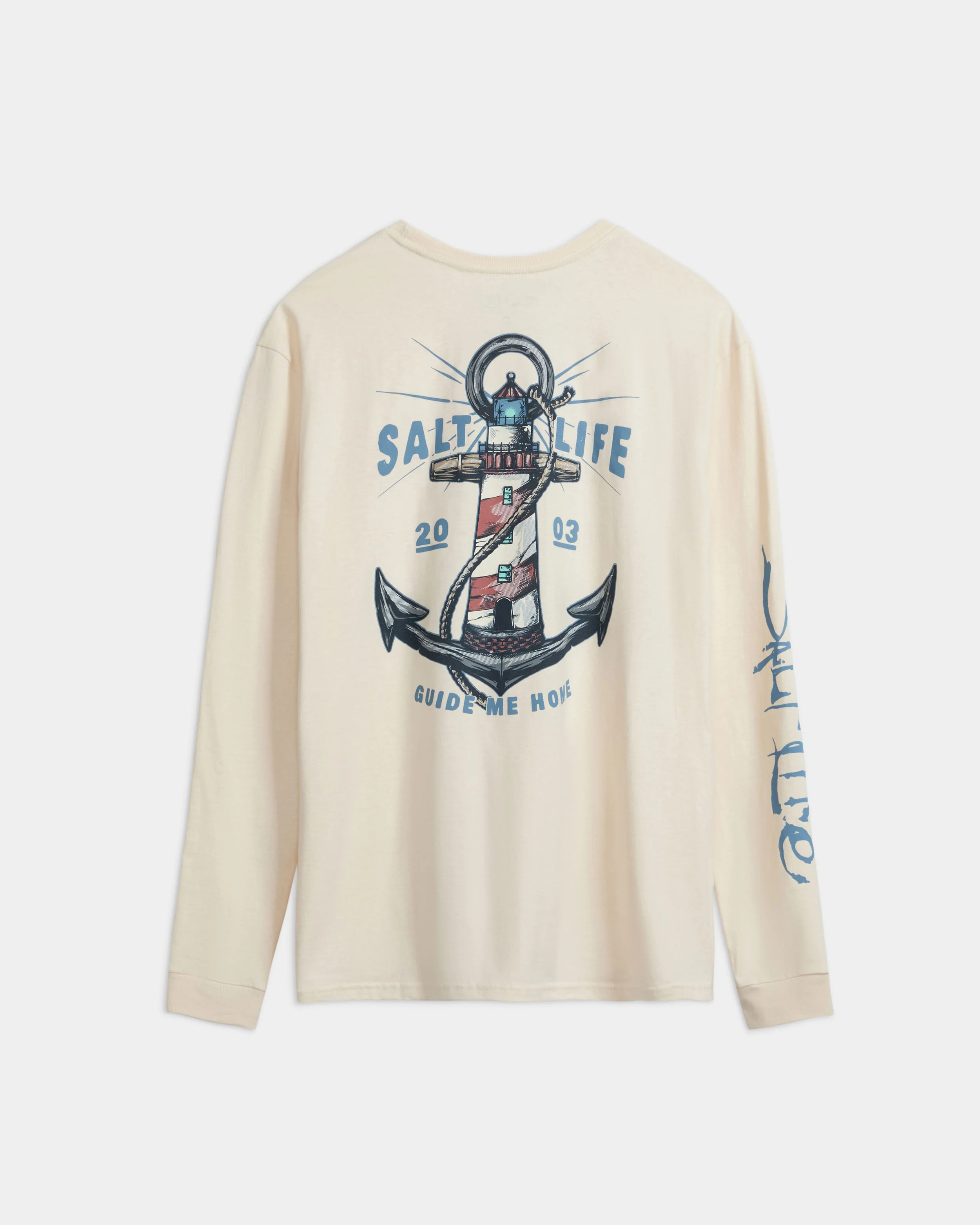 The Salt Life Men’s Guide Me Home Long Sleeve Tee features a classic crew neck, cuffed sleeves, and a regular fit for everyday comfort. It showcases the Guide Me Home design on the back, with Salt Life logos printed on the chest and sleeve for subtle branding.