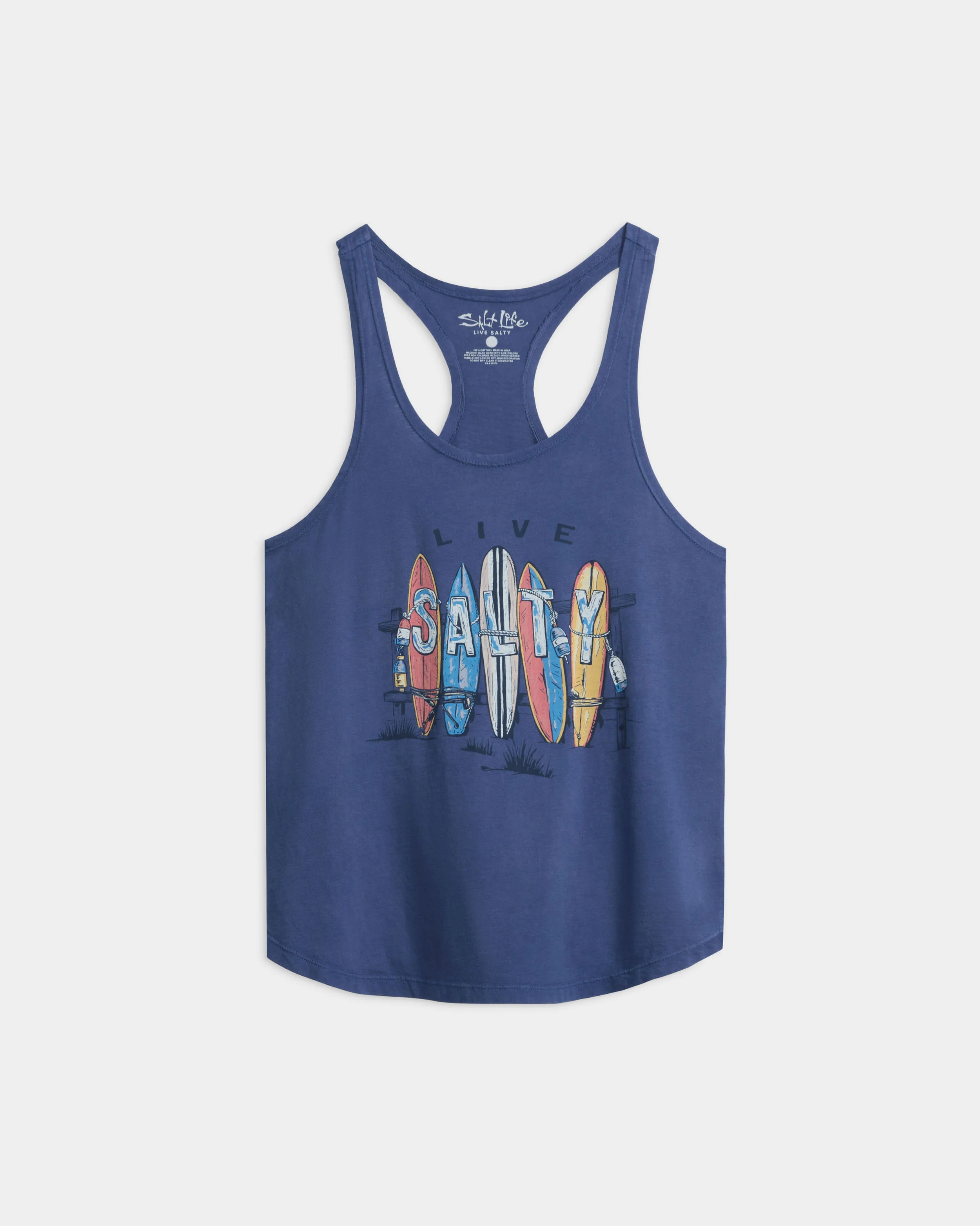 Made for sun-filled days, this racerback tank combines a relaxed fit with a scalloped hem for easy movement. The salt wash finish gives it that worn-in, beach-ready look. A bold screen print on the front keeps your coastal spirit front and center.