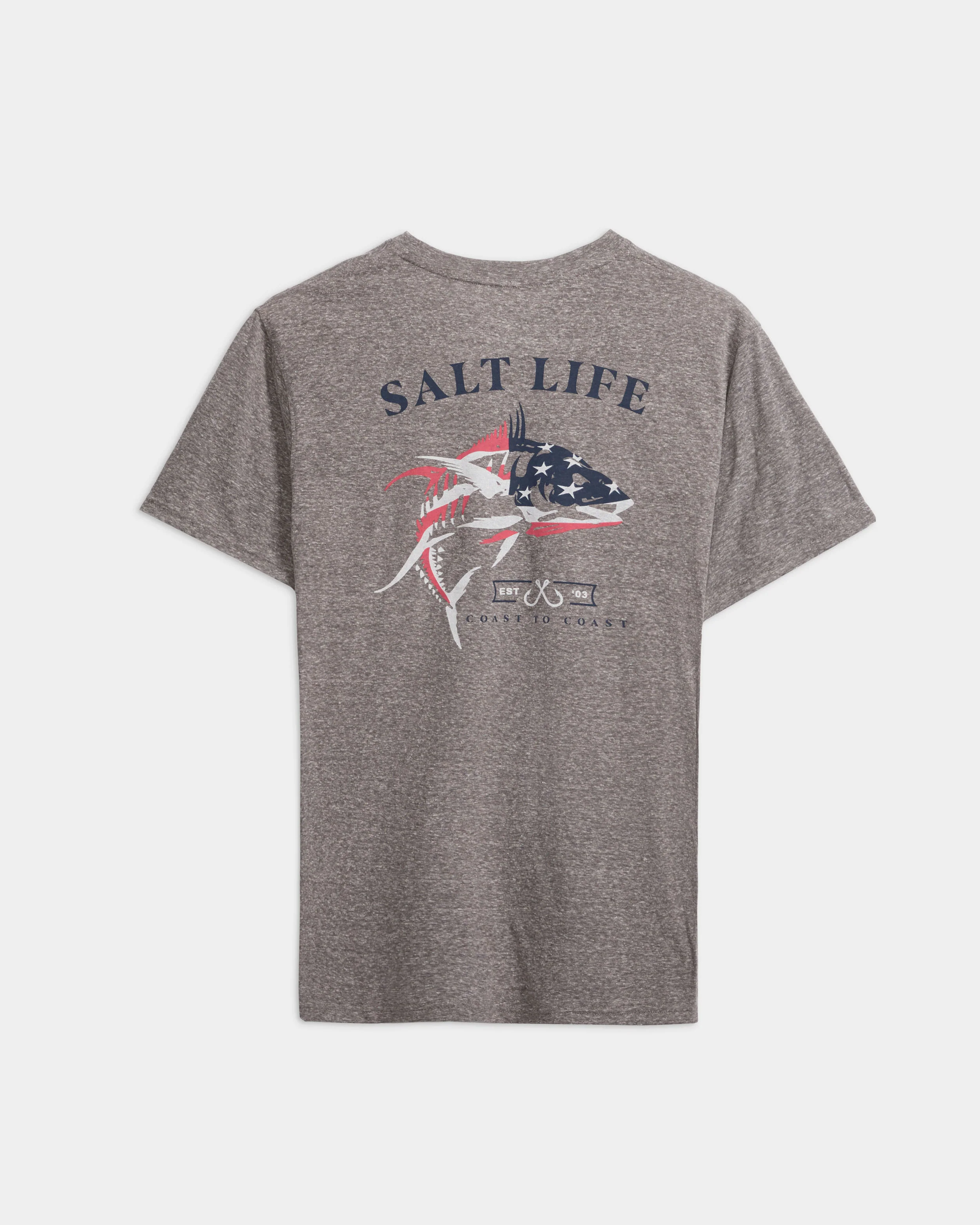 Show your patriotic pride with the United We Fish tee. Featuring a bold American flag fish graphic, this ultra-soft tri-blend shirt delivers comfort, style, and a love for life on the water. Perfect for anglers, adventurers, and anyone living the Salt Life from sea to shining sea.